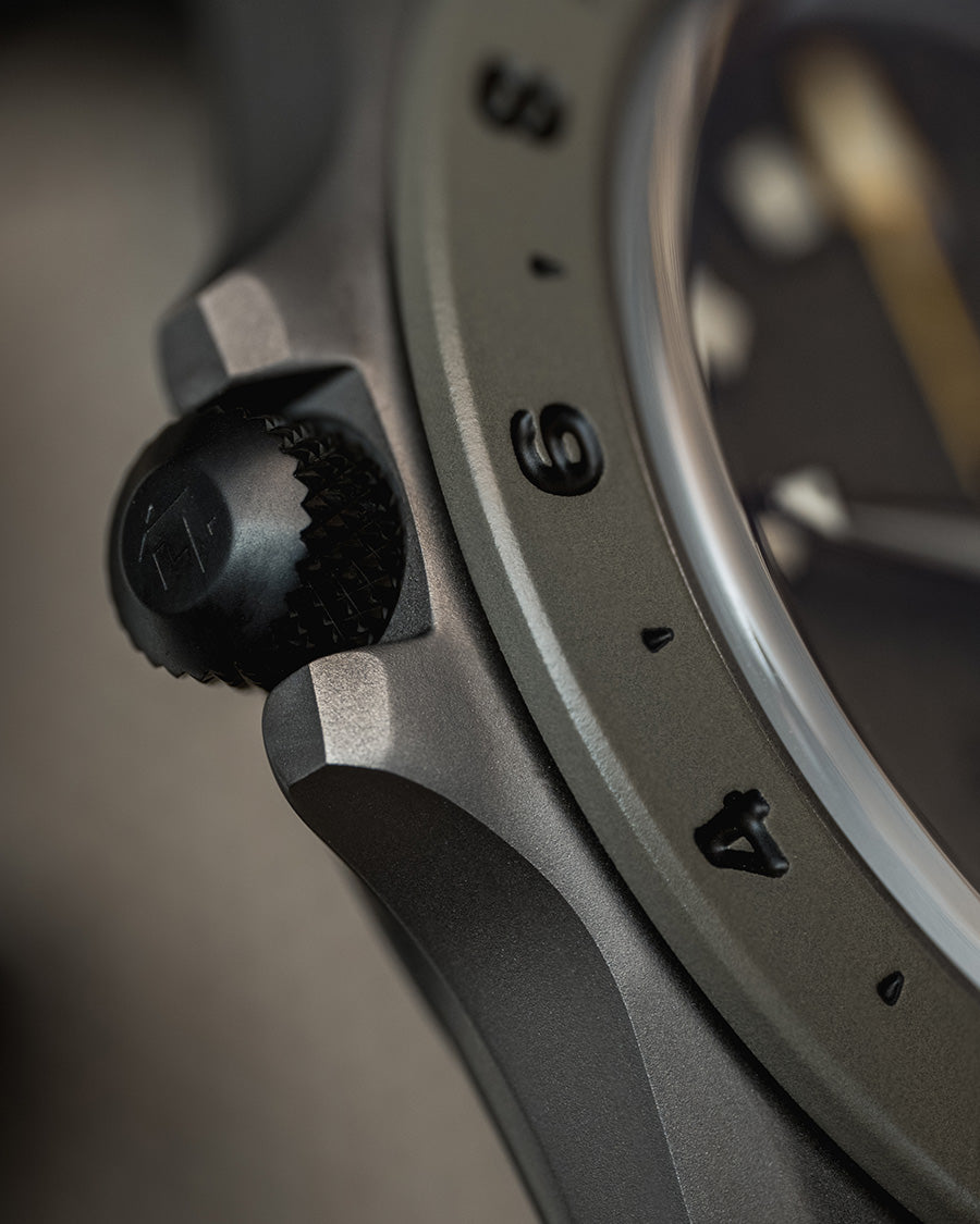 For added protection, the fixed bezel and dial are coated with a sand-colored Cerakote®. The bezel features an engraved 24-hour scale filled in with black lacquer for tracking a second timezone.